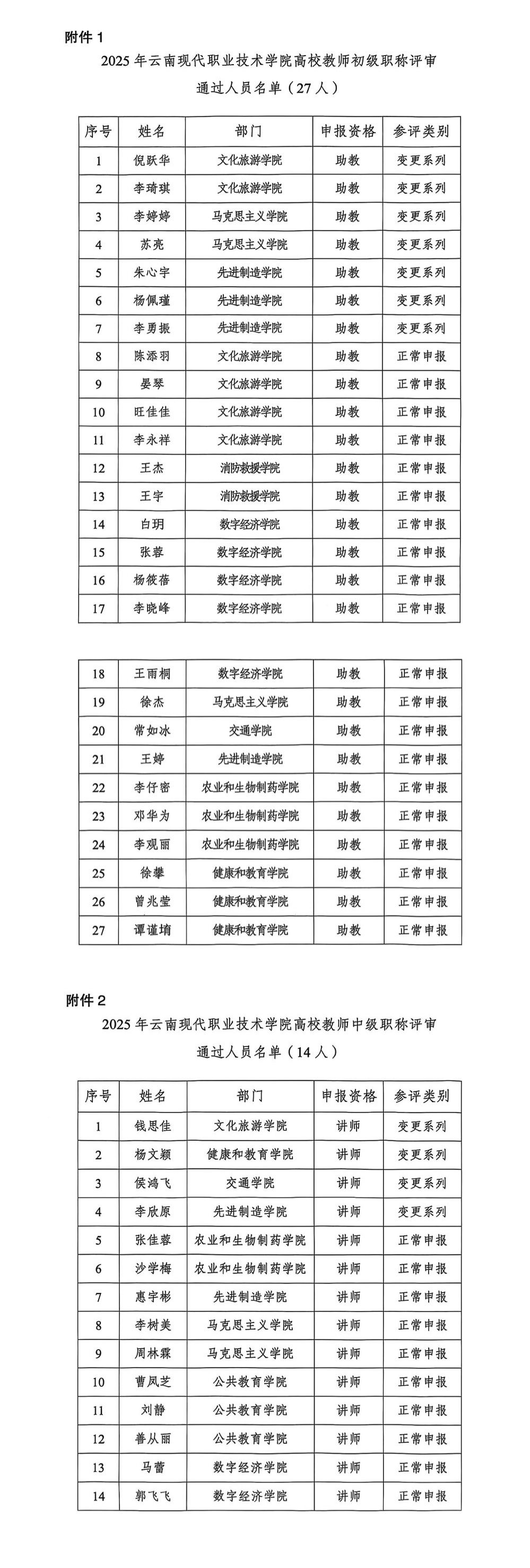 附件:1.2025年云南现代职业技术学院高校教师初级职称评审通过人员名单(27人)